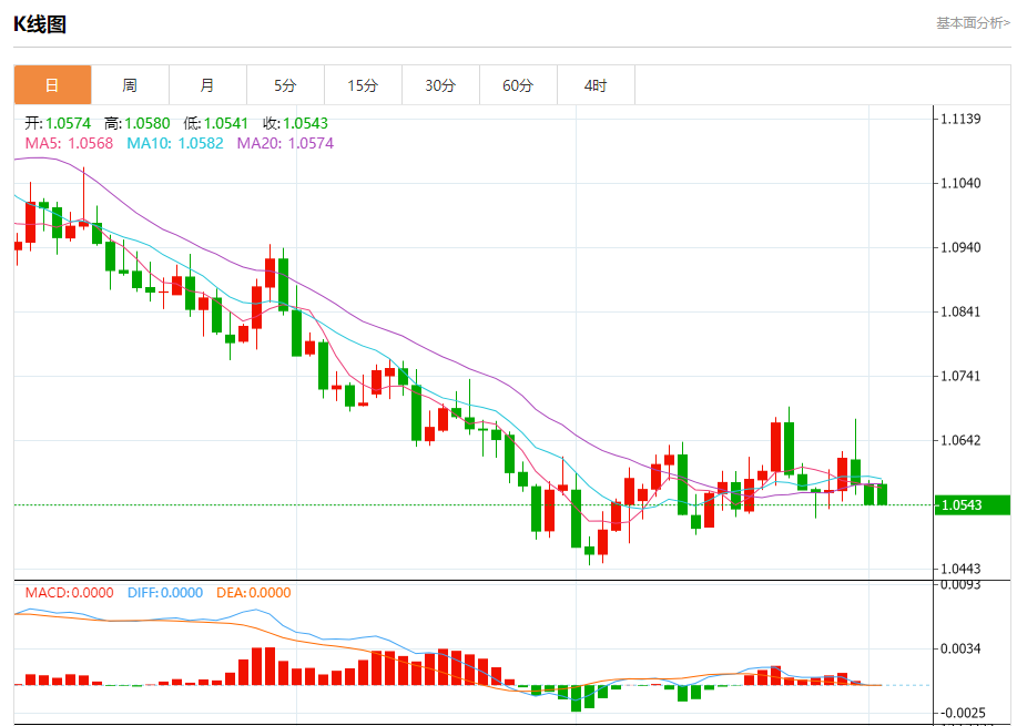 周三欧市盘中,欧元兑美元交投于1.0544,跌幅为0.28%。