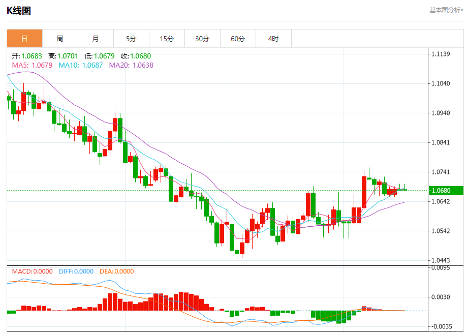 今日周一,截止目前欧元兑美元报1.0681,下跌0.03%。