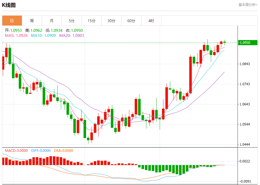 周二欧市盘中,欧元兑美元交投于1.0950,跌幅为0.04%。