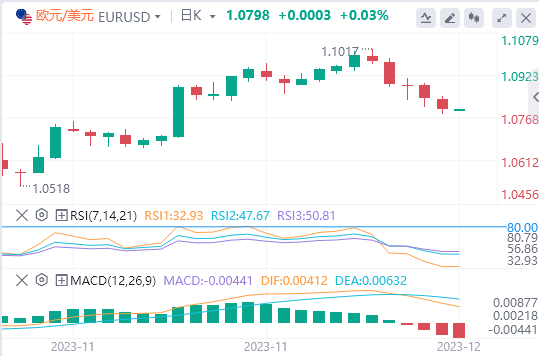 尽管JOLTs职位空缺下降幅度大于预期,表明劳动力市场更加平衡,但美元走强推动欧元/美元下跌。11月份ISM服务业采购经理人指数升至52.7,出乎预期。随着通胀放缓和劳动力市场收紧,美联储被认为已经完成了紧缩周期。市场参与者预计美联储将在2024年降息,尽管目前美联储官员并未提出这一建议。周三将公布ADP就业人数变化。