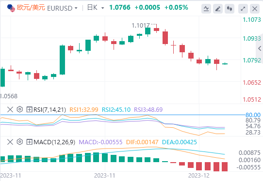 2、欧元/美元跌破200日均线将使空头在1.06342美元的支撑位运行。14周期每日RSI45.15表明欧元/美元在进入超卖区域之前跌至1.07000美元价格,