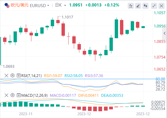 2、欧元/美元跌破1.09294美元的支撑位将支持跌至50日均线。14周期每日RSI58.12表明欧元/美元在进入超买区域之前会回到1.10美元。