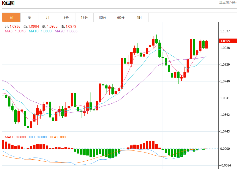 周四欧市盘中,欧元兑美元交投于1.0982,涨幅为0.37%。