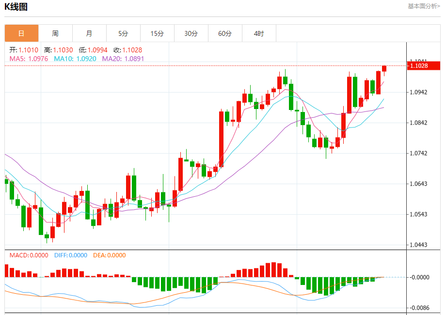 周五欧市盘中,欧元兑美元交投于1.1031,涨幅为0.18%。