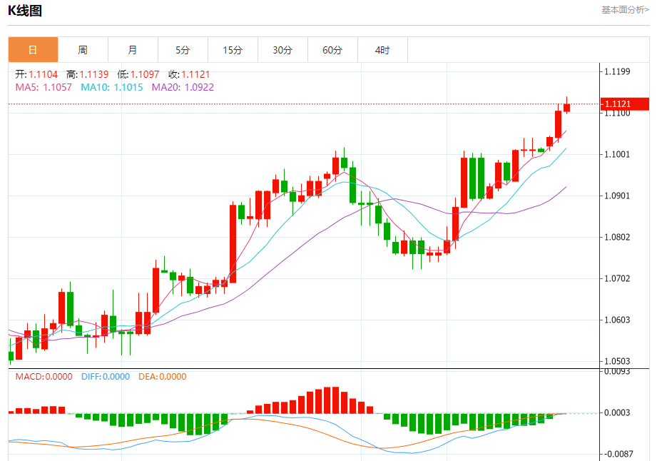 今日周四,截止目前欧元兑美元报1.1122,上涨0.15%。
