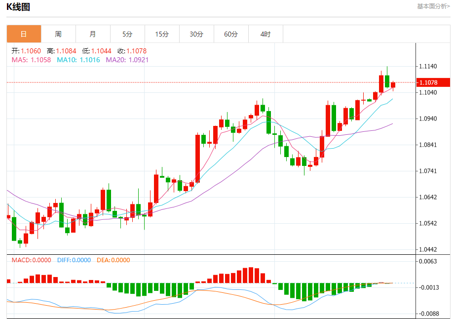 周五欧市盘中,欧元兑美元交投于1.1080,涨幅为0.16%。