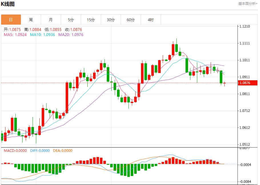今日周三,截止目前欧元兑美元报1.0878,上涨0.02%。
