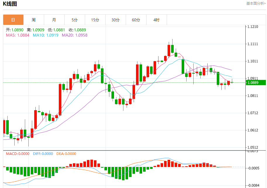 今日周一,截止目前欧元兑美元报1.0889,下跌0.07%。