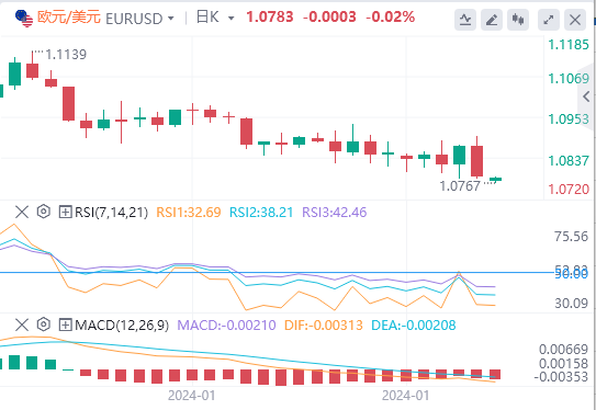 欧元/美元在上周五后半日大跌并于上周收跌。美国数据显示1月非农人口增长35.3万,远高于市场预期18万。美元兑主要货币因此大涨。根据CME集团的美联储观察工具,美联储在3月降息的概率下降至15%左右,周五盘初为30%。