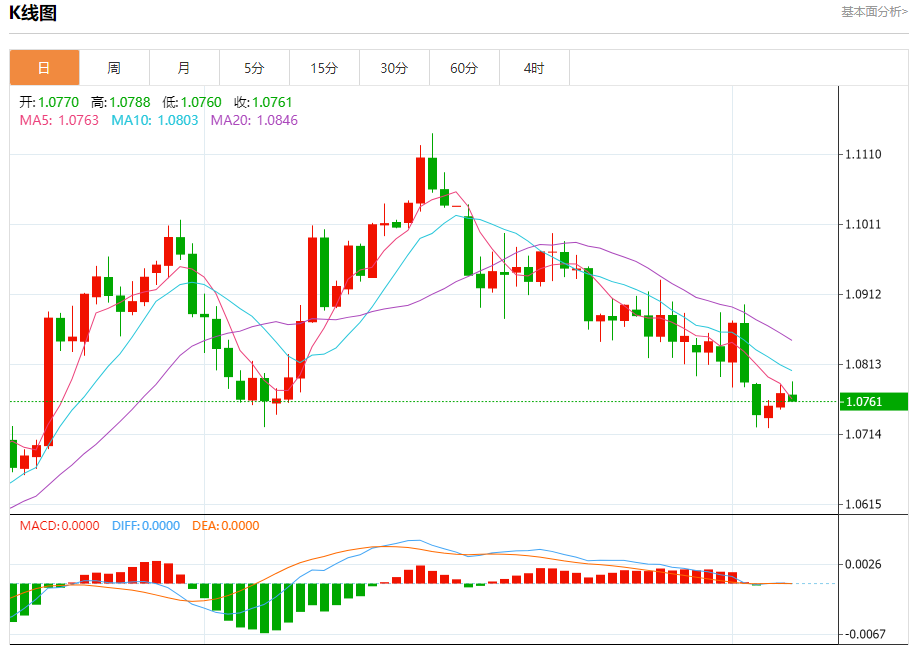 周四欧市盘中,欧元兑美元交投于1.0762,跌幅为0.10%。