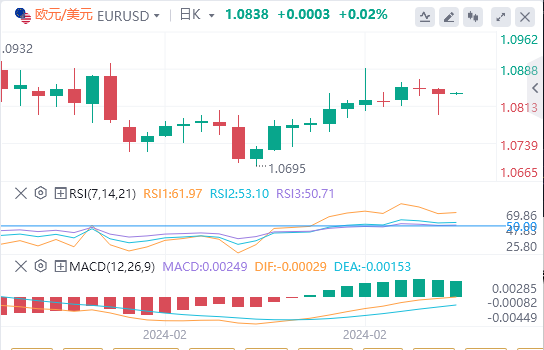 日K线仍然受阻于1.0830附近的200日简单移动平均线(SMA),尽管从上一个摆动低点看涨反弹至1.0700,但欧元/美元继续进入买入中位数。该货币对仍较去年12月的峰值1.1140下跌了近3%。