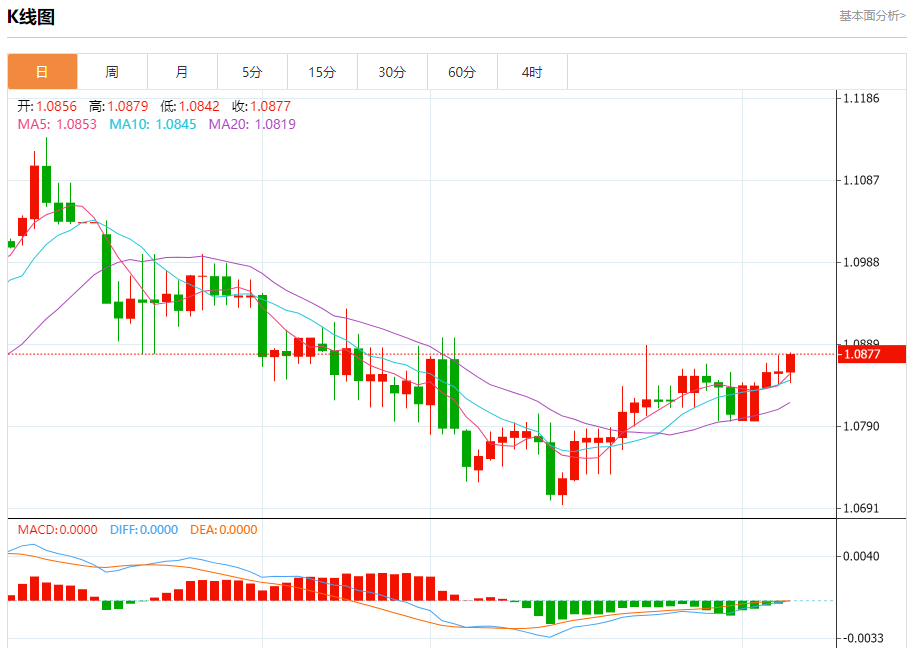 今日周三,截止目前欧元兑美元报1.0878,上涨0.19%。