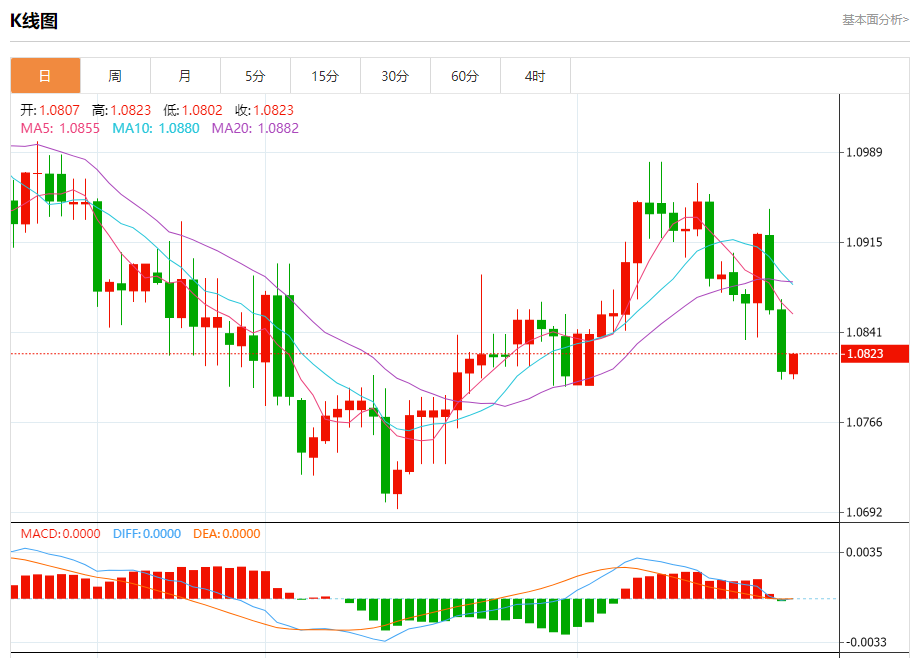 今日周一,截止目前欧元兑美元报1.0823,上涨0.13%。