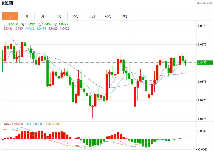 今日周四,截止目前欧元兑美元报1.0477,下跌0.07%。