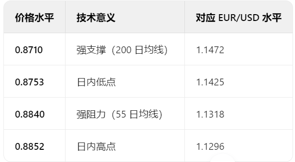 多头修复:若汇价站稳 0.8840 阻力位,可能测试 0.8900(对应 EUR/USD 1.1236),但需警惕 RSI 超买信号。
