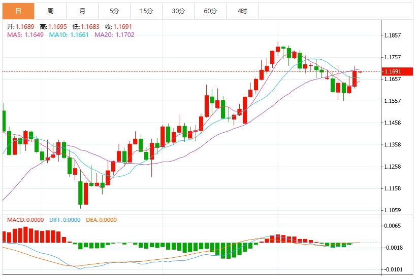 从日线K线图来看,欧元兑美元当前运行在布林带中轨附近,布林带中轨(1.1655)构成短线支撑,上轨在1.1851,下轨在1.1460。汇价自低点1.0732启动上升趋势,但触及高点1.1829后出现回撤迹象。分析认为若有效突破1.17区域,将有望再度挑战年内高点区域。