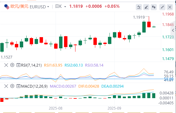 欧元/美元在最近几个交易日盘整后似乎正在接近突破。阻力位在2025年上限1.1918(9月17日),如果明显突破,将使1.2000心理水平重新发挥作用。