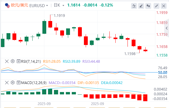 直接阻力位在1.1645-1.1650区域(9月25日和10月6日低点),下降趋势线阻力位在1.1720附近。突破该水平将表明趋势转变,并使上周高点1.1765-1.1775区域成为焦点。
