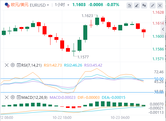 10月23日,周四亚市盘中,欧元/美元徘徊在1.1603附近。