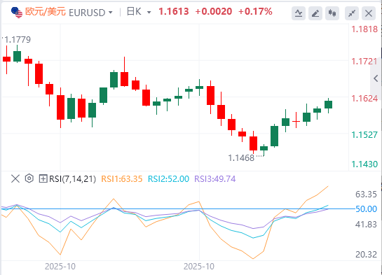 在4小时图上,欧元/美元交易于1.1616,日内小幅上涨。简单移动平均线(SMA)显示出更强的走势,20期均线高于100期均线,而50期均线也在上升。价格保持在20、50和100期均线之上,尽管缓慢下降的200期均线仍限制着上涨空间。相对强弱指数(RSI)为66.8,接近超买区域,增强了看涨动能。