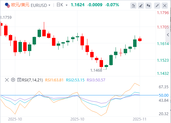 在4小时图中,欧元/美元交易于1.1637,日内变化不大。短期内,简单移动平均线(SMA)向上倾斜,20期和50期线在价格高于所有关键均线时上升。100期SMA开始上升,而200期SMA则略微下滑。20期SMA在1.1598处提供附近的动态支撑。相对强弱指数(RSI)位于67.7,接近超买,与强劲的看涨动能一致。从1.1885高点到1.1471低点,阻力位在50%回撤位1.1678和61.8%回撤位1.1727。