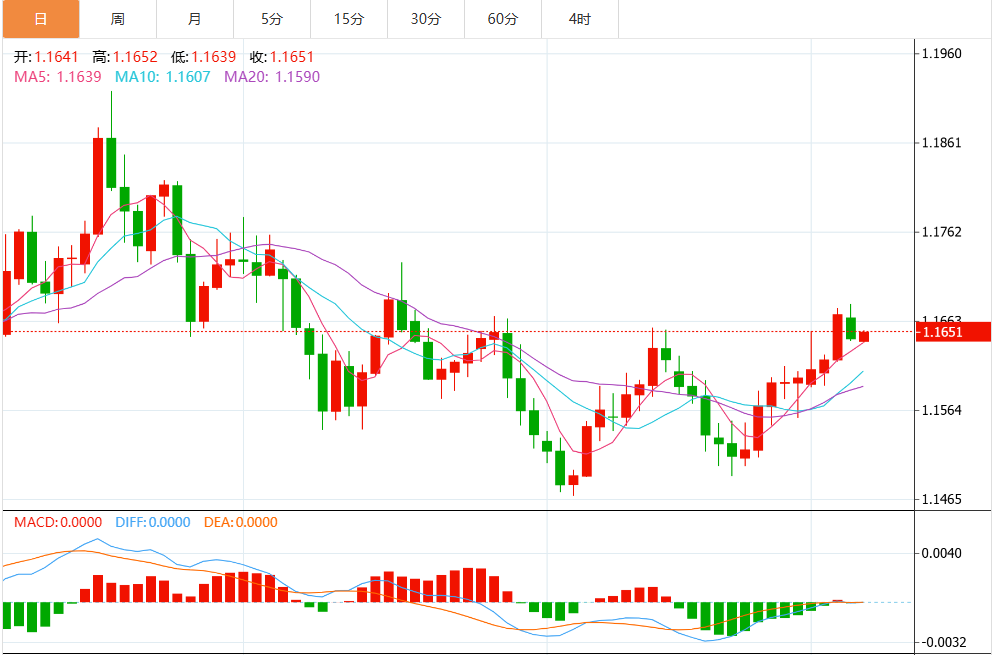 周五亚盘,欧元/美元盘中拉升,现报1.1651附近,日内上涨0.07%。