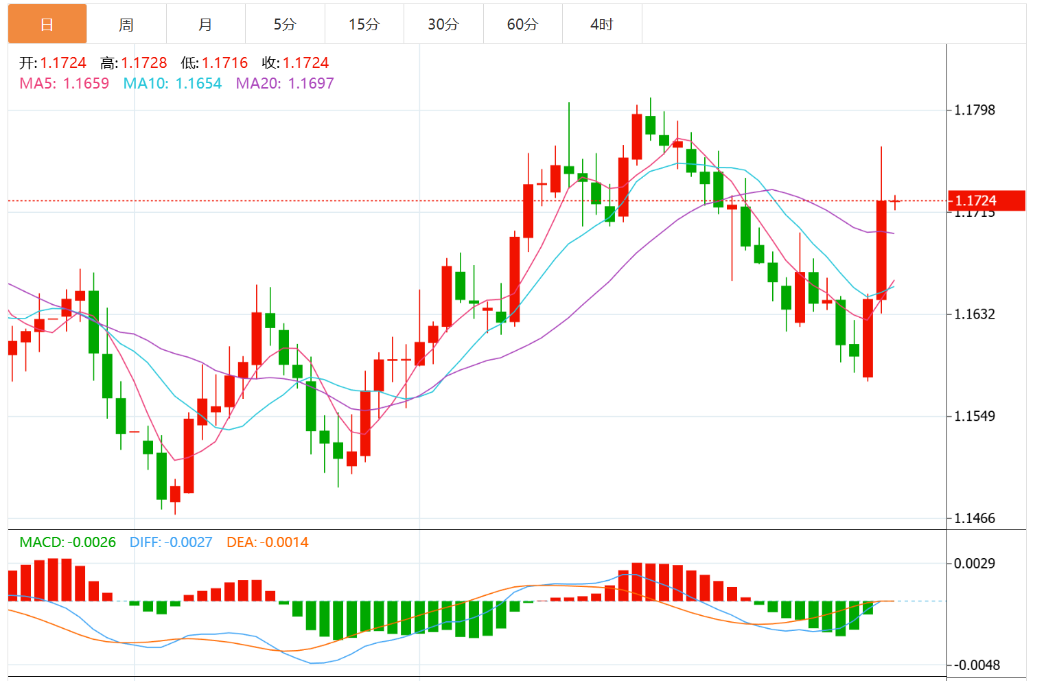 今日周四,截止目前欧元兑美元报1.1704,上涨0.18%。
