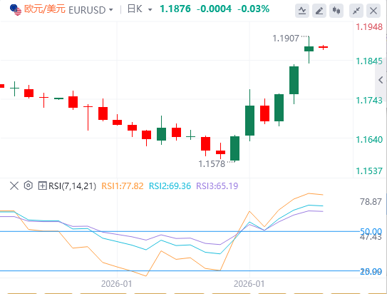 相对强弱指数(RSI)衡量的动能表明买方掌控一切。此外,12月24日明显突破1.1807的摆动高点,使趋势从横盘转为上升。