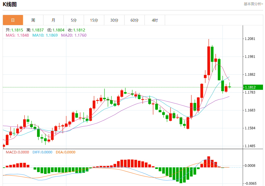 今日周三,截止目前欧元兑美元报1.1813,下跌0.03%。