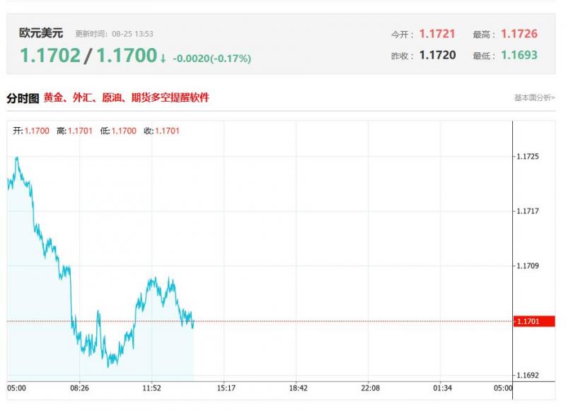 8月26日,周二欧市盘中,欧元/美元在周一美国时段开盘前将从周五高点1.1742的反转扩大至1.1700下方的水平。德国商业景气指数略好于预期,但未能支撑欧元,在美联储主席杰罗姆·鲍威尔转向鸽派后,欧元仍保持着周五的大部分涨幅。 鲍威尔在杰克逊霍尔研讨会上让投资者感到惊讶,他警告说,“就业下行风险正在上升”,如
