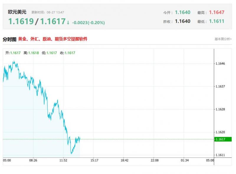 8月26日,周二亚市盘中,欧元/美元徘徊在1.1653附近。 在美联储主席杰罗姆·鲍威尔发表鸽派言论后,欧元/美元抹去了上周五的部分涨幅并下跌0.93%,美元开始复苏。对美联储将在9月降息的预期引发了欧元(UR)的上涨。在撰写本文时,该货币对回到1.1700下方,位于1.1610附近。 美元的回升似乎是由交易员获利了结引发的,