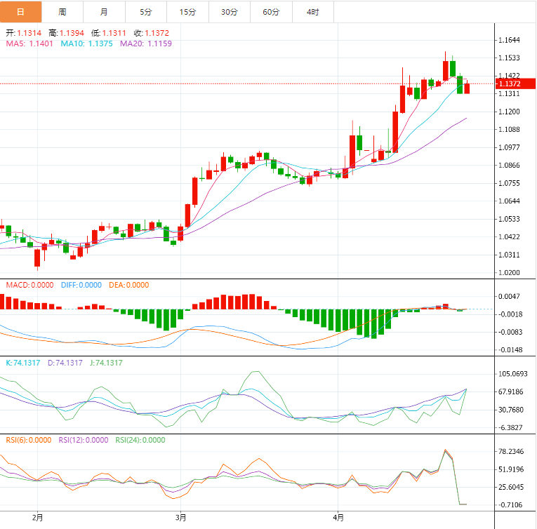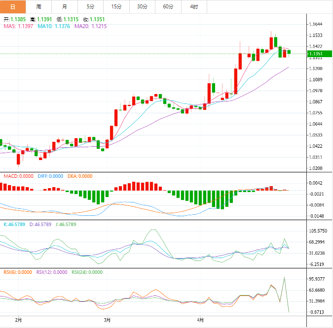 欧元兑美元今日汇率最高1.1328,最低1.1326,涨跌-0.0062,涨跌幅-0.54%。 市场基本面分析 欧洲央行管委雷恩:欧洲央行不应排除更大幅度降息的可能性。委员会将于5月6日至7日讨论战略评估,考虑改变策略,以实现更灵活的行动。德国经济部:德国政府预测2025年经济将陷入停滞,此前的预测是增长0.3%。德国