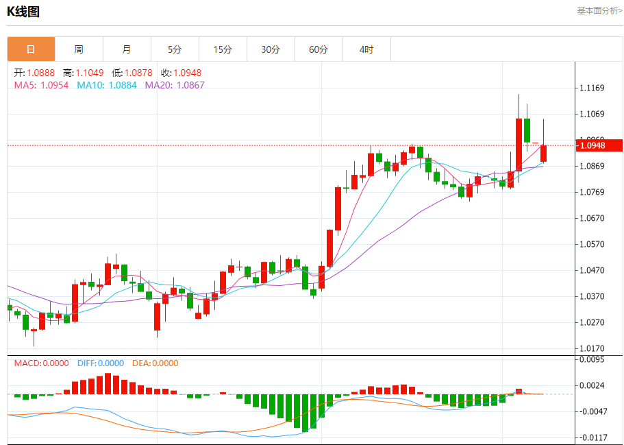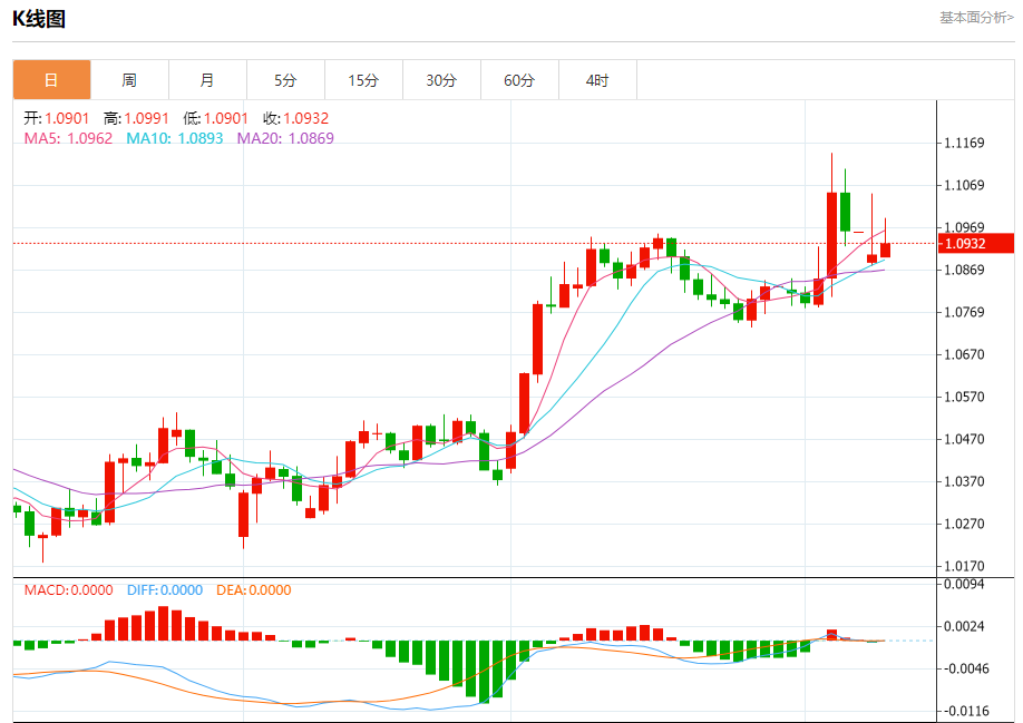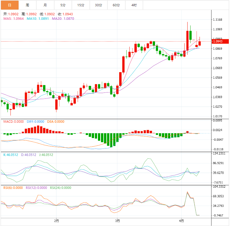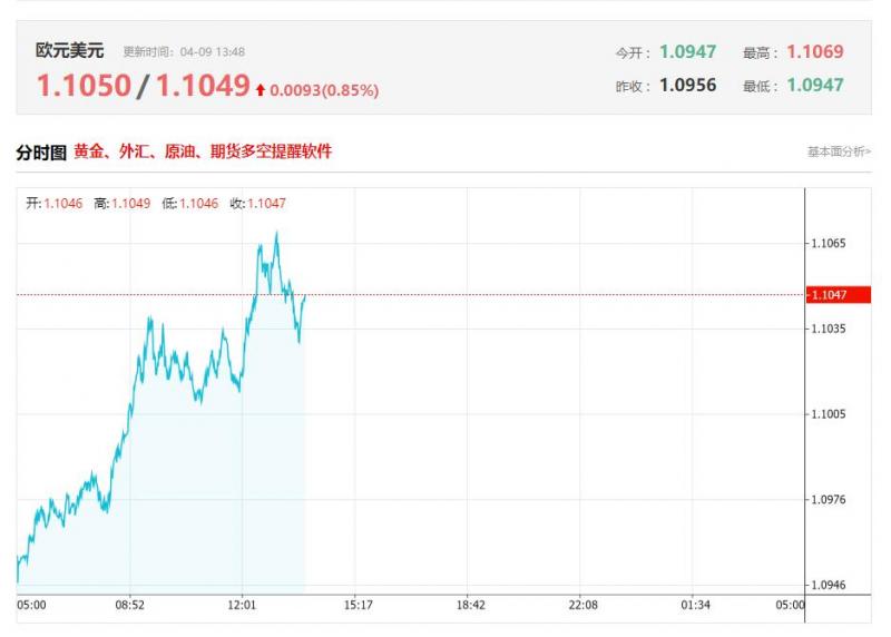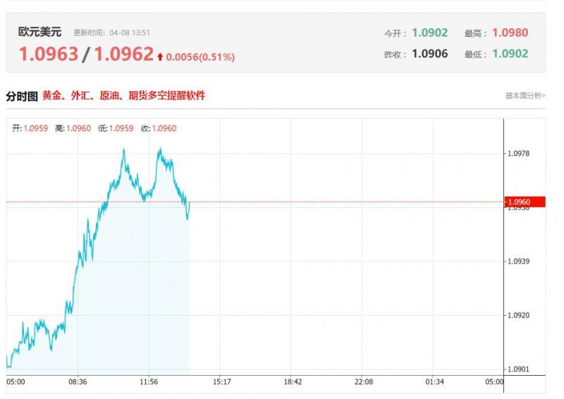 在全球经济前景充满不确定性以及贸易局势紧张的大背景下,外汇市场上欧元兑美元货币对的走势备受投资者瞩目。4月8日,欧元兑美元汇率波动频繁,截至19时59分,汇率为1.0938,较昨日收盘价上涨0.00337,涨幅达0.2475%,日内最高触及1.0992,最低下探至1.0907。 货币兑:欧元/美元 一、行情分析 (一)隔夜表现与