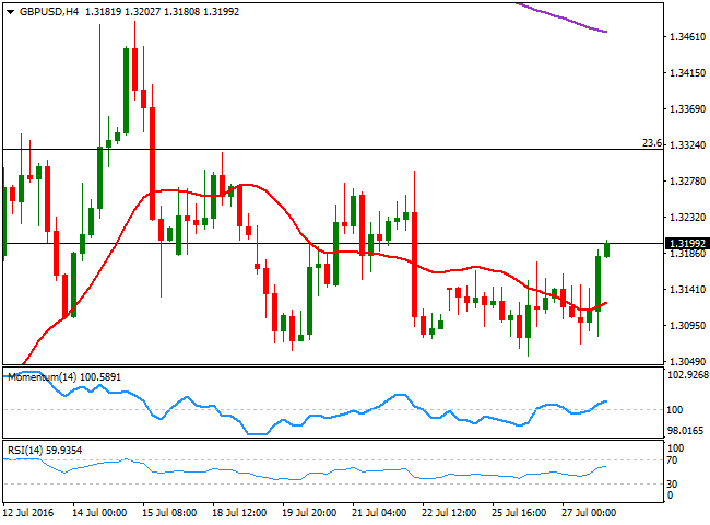 目前英镑/美元交投于前述高位附近,短线技术面倾向于上行,1小时图上,技术指标在超买领域快速走高,20SMA在汇价下方适度走高。