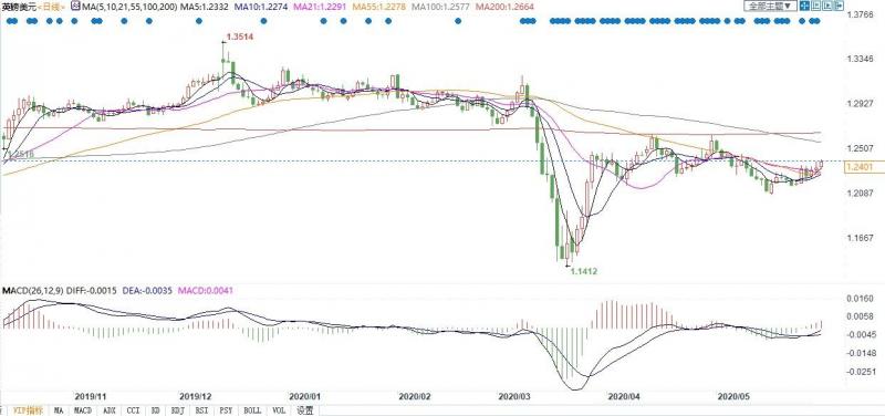 受英国可能推出新刺激计划的影响,6月1日亚市早盘英镑兑美元一度顶破1.24关口,刷新三周高点至1.2415。目前上涨0.52%,交投于1.2400附近。本周投资者除了关注政府刺激计划,还需关注本周英国与欧盟的脱欧第四轮谈判,也是预定谈判计划的最后一轮,如有更多利好有望提振英镑继续反弹,挑战100日均线1.2577阻力。但据先前外媒报道,传英国可能放弃与欧盟达成贸易协议,若真是如此恐打压英镑,此次反弹可能昙花一现。