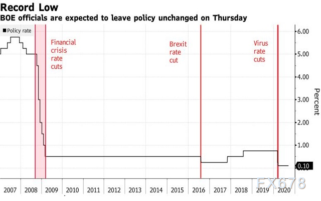 下图显示了英国的政策利率变动情况,市场预期周四决议将维持利率不变