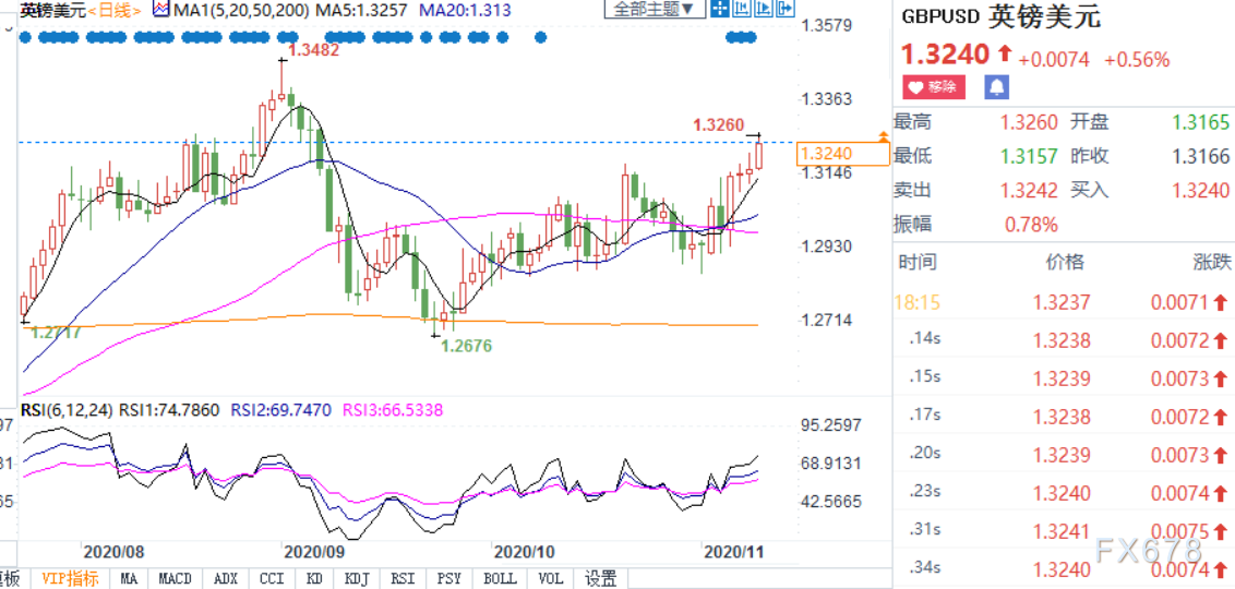 周二(11月10日)欧市盘中,英镑兑美元持续上涨最高触及1.3260,为9月7日以来新高,因英国脱欧谈判前景被投资者进一步押注为乐观,并且疫苗研发获得进展的状况同样也令欧系风险货币相对美元走强,这进一步巩固了英镑汇价的上行趋势,另外此前英国下令卫生服务机构为12月开始部署疫苗做好准备,由于疫苗的消息,英国央行在2021年实行负利率的英镑利空风险已经降低。
