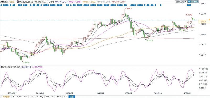 因有消息称英国和欧盟可能会错过11月中旬签署新协议的最后期限,11月11日英镑美元大跌,一度拉升至1.3312,后下落至1.3192,下跌120点,最后收盘在1.322附近。进如11月12日后,英镑维持弱势震荡格局,目前进一步回落至1.32下方。