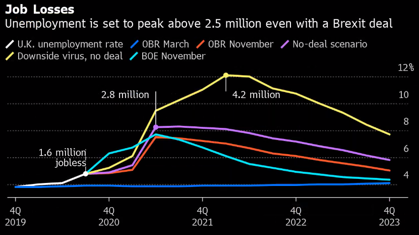 即使当局做出了最大努力,英国的失业率仍将继续上升。英国央行预计明年的失业率将攀升至约7.5%。英国预算责任办公室预计,在不利的情境下,失业率会超过10%。