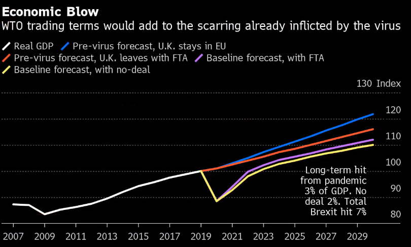 脱欧和新冠疫情是残酷的双重打击。相关经济研究预测,即使英国达成脱欧贸易协议,长期经济增长也会降低8%。如果没有达成协议,则降低程度还会再增加2%。