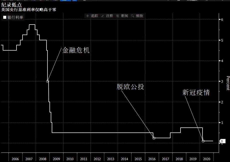 下图显示的是英国央行的基准利率变动情况,目前处于记录低点,仅略高于零的水平