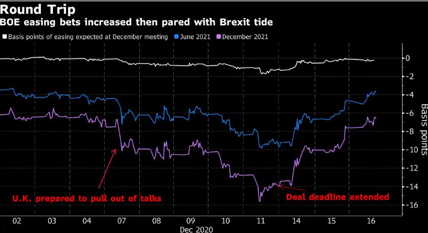 如下图所示,对英国央行是否会加码刺激的押注伴随脱欧贸易协议的前景起起落落