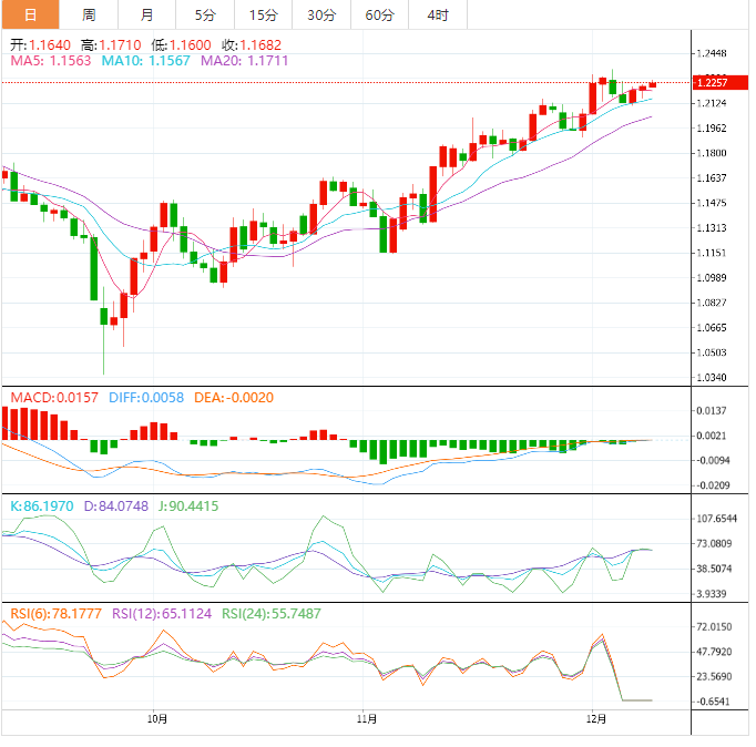 英镑兑美元在测试了11月24日的水平支撑位1.2153后大幅反弹。分别从9月26日低点1.0339和11月9日低点1.1334绘制的长期和次级上行趋势线将继续支持英镑。