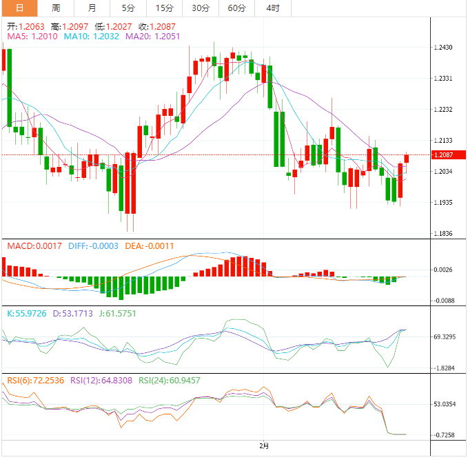 2月英镑表现稳定,连续第二个月上涨,2月开盘价为1.2318,目前汇价1.2092(截止目前),2月已经下跌226点,2月2日触及最高点1.2401,最低点触及1.1915。