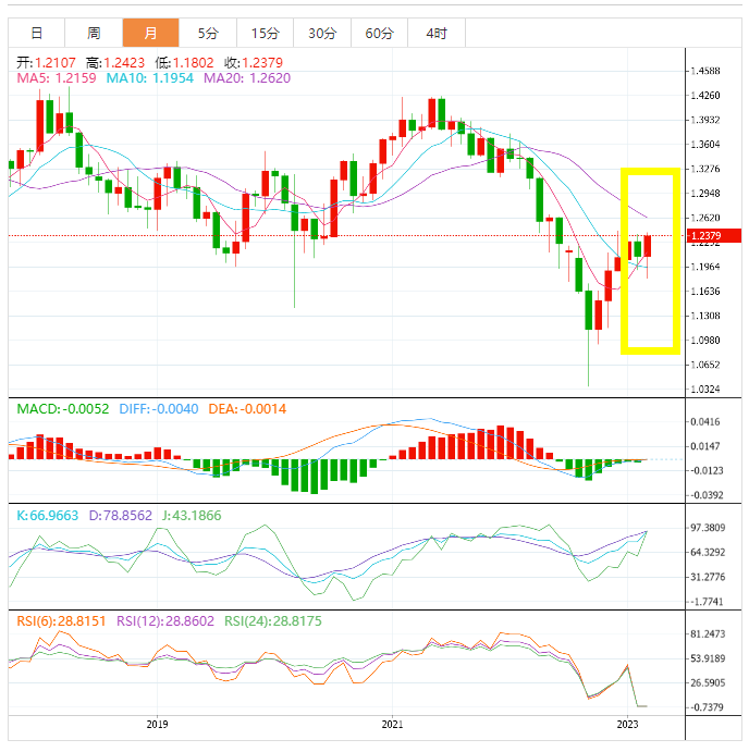 3月英镑表现稳定,月内趋势呈现直线上涨,对比2月小幅上涨,3月开盘价为1.2019,目前汇价1.2379(截止目前),3月已经上涨360点,3月31日触及最高点1.2423,3月8日最低点触及1.1802。