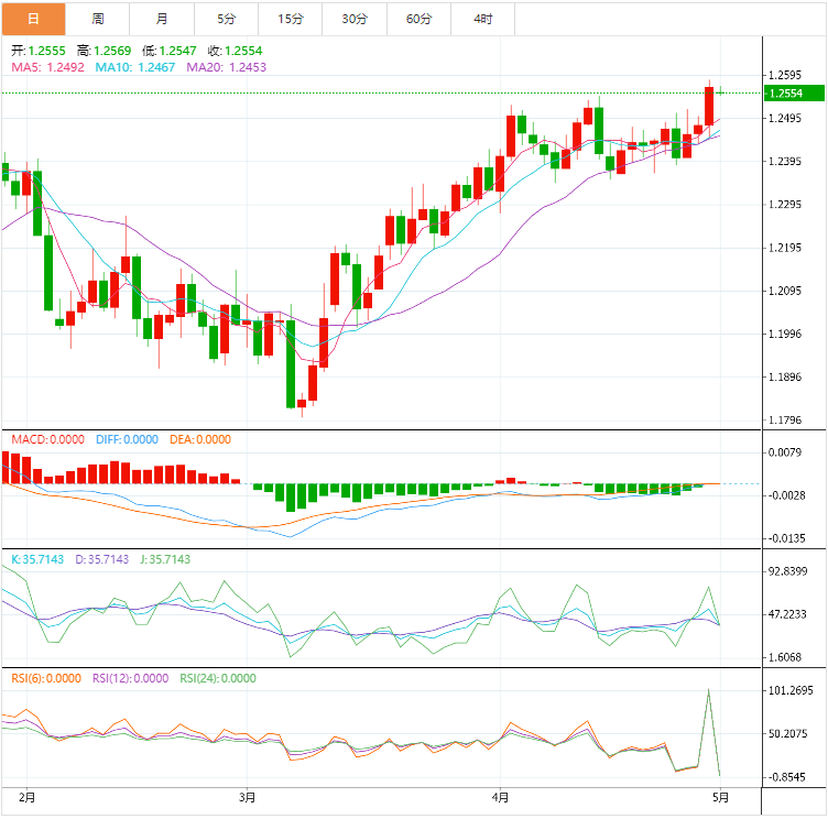 英镑兑美元在两小时内突破了上升通道图表模式。上升通道图表形态的上行突破表明英镑绝对强势。近期支撑位位于4月14日的高点1.2546。