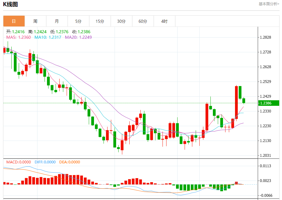 周四欧市盘中,英镑兑美元交投于1.2387,跌幅为0.24%。