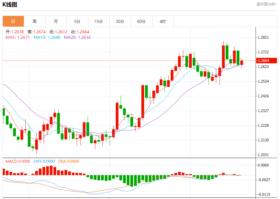 周四欧市盘中,英镑兑美元交投于1.2665,涨幅为0.21%。