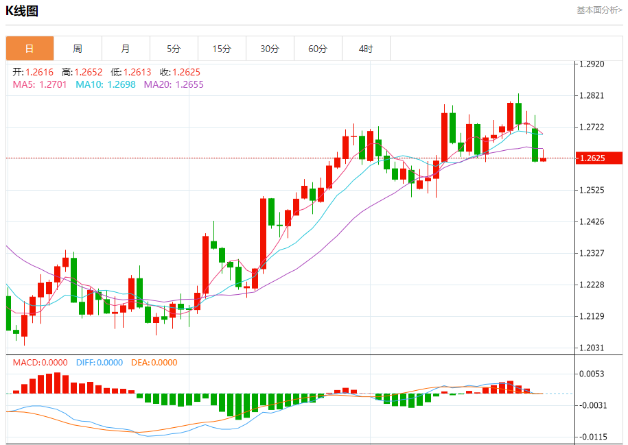 周三欧市盘中,英镑兑美元交投于1.2627,涨幅为0.08%。