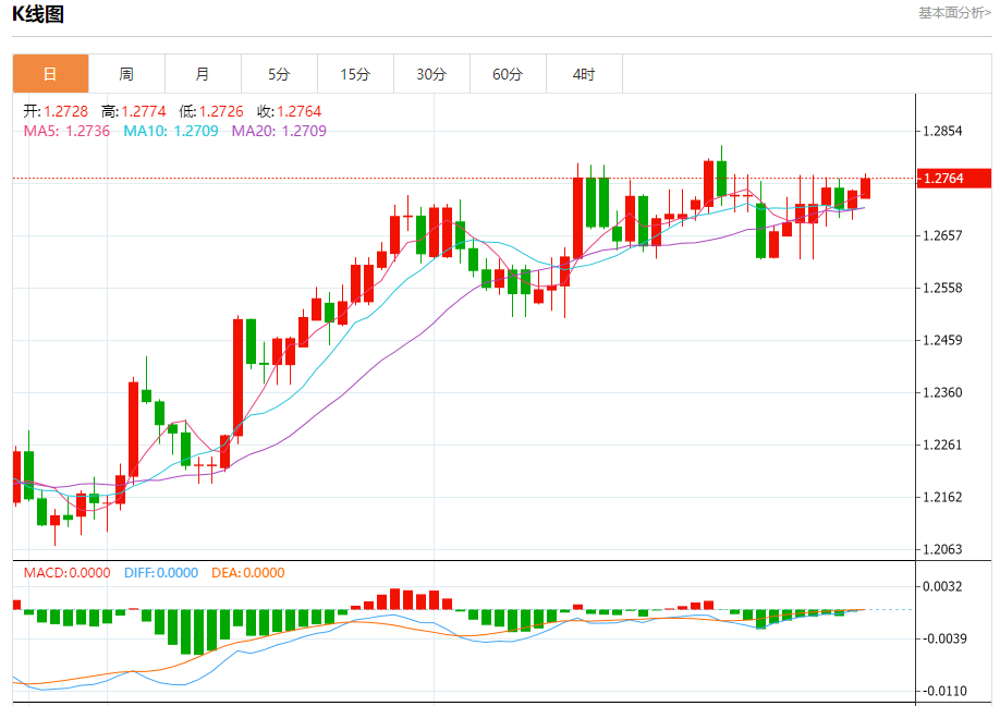 周四欧市盘中,英镑兑美元交投于1.2765,涨幅为0.18%。